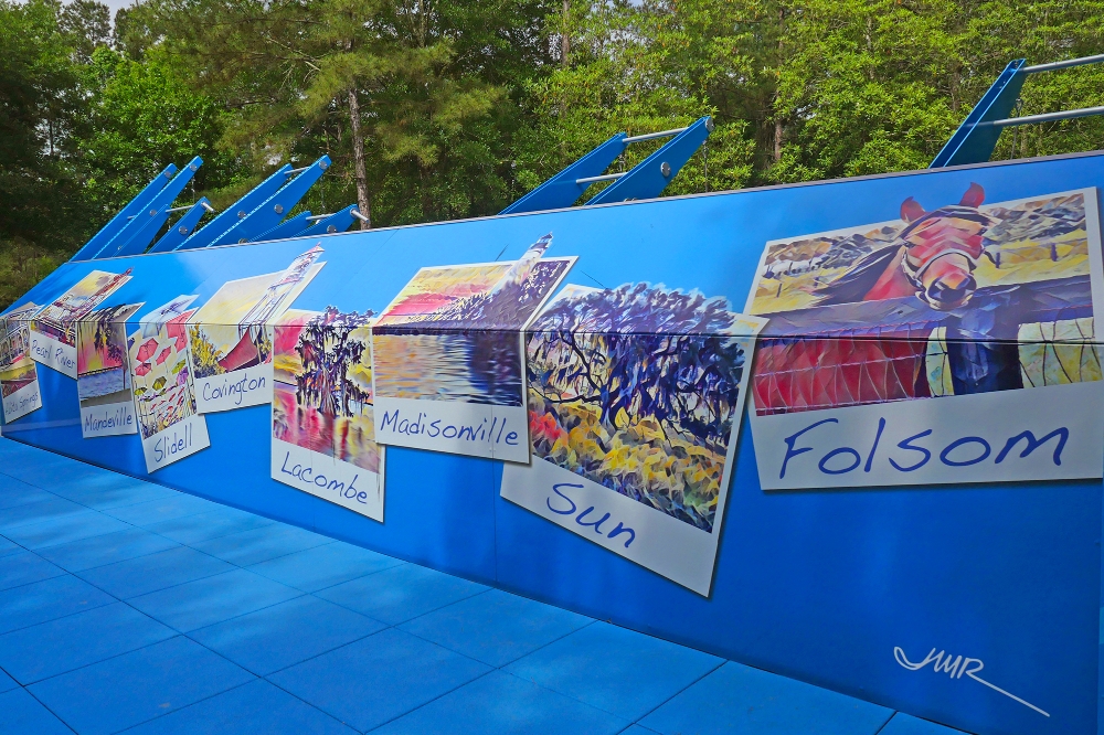 At Koop Drive, Covington artist and City Councilmember Joey Roberts created “Hometown,” a mural that captures the essence of life across St. Tammany Parish. With a background in kinesiology and a personal passion for fitness, Roberts was inspired to submit a design that reflects the towns that shaped him. “I had an image of Polaroid shots coming to life in my head,” Roberts said. His mural showcases snapshots of communities including Abita Springs, Pearl River, Mandeville, Slidell, Covington, Lacombe, Madisonville, Sun, and Folsom—each filled with personality and place-based pride.