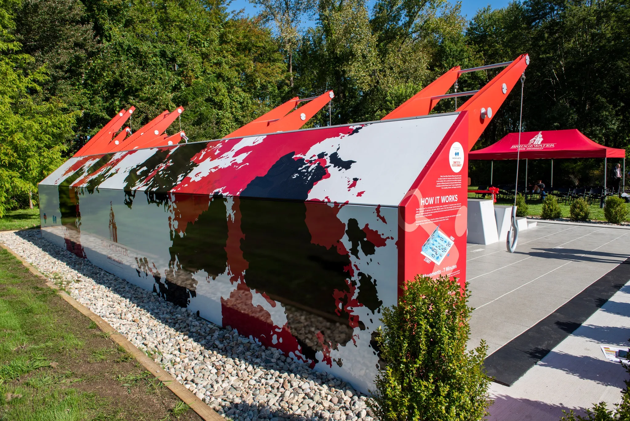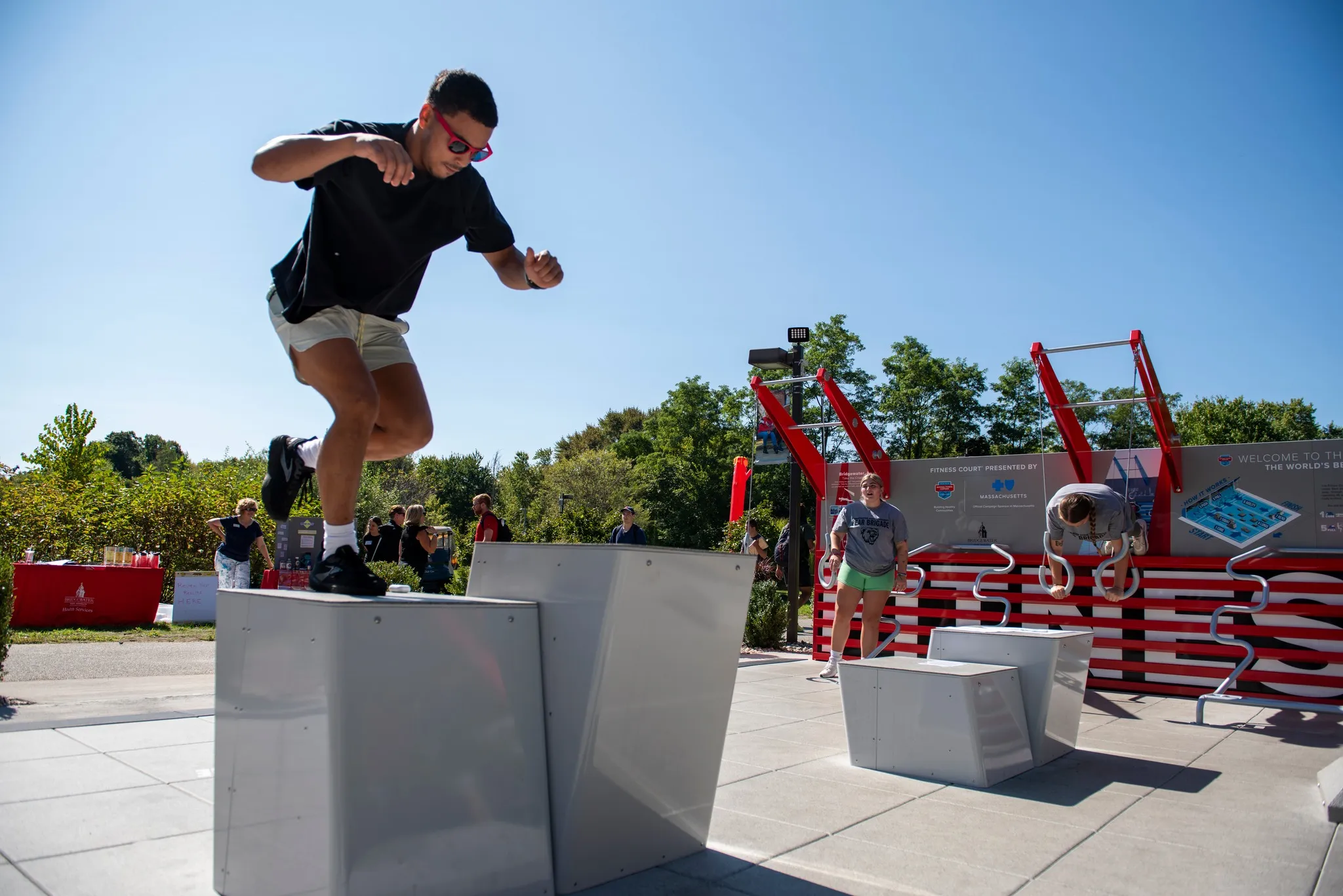 On a sunny fall day, the campus of Bridgewater State University (BSU) was buzzing with excitement as they joined the Blue Cross campaign – the first higher education partners in the state to do so. Located in a prime spot on campus at University Park, the Fitness Court® is not only open to the campus community but the public at large. In collaboration with BSU and Blue Cross, custom art was created specific to the University. The world’s best outdoor gym pops throughout with BSU’s trademark red, as well as some black-and-white imagery.