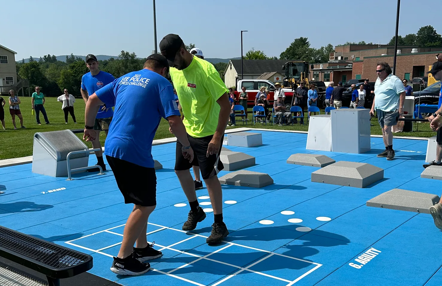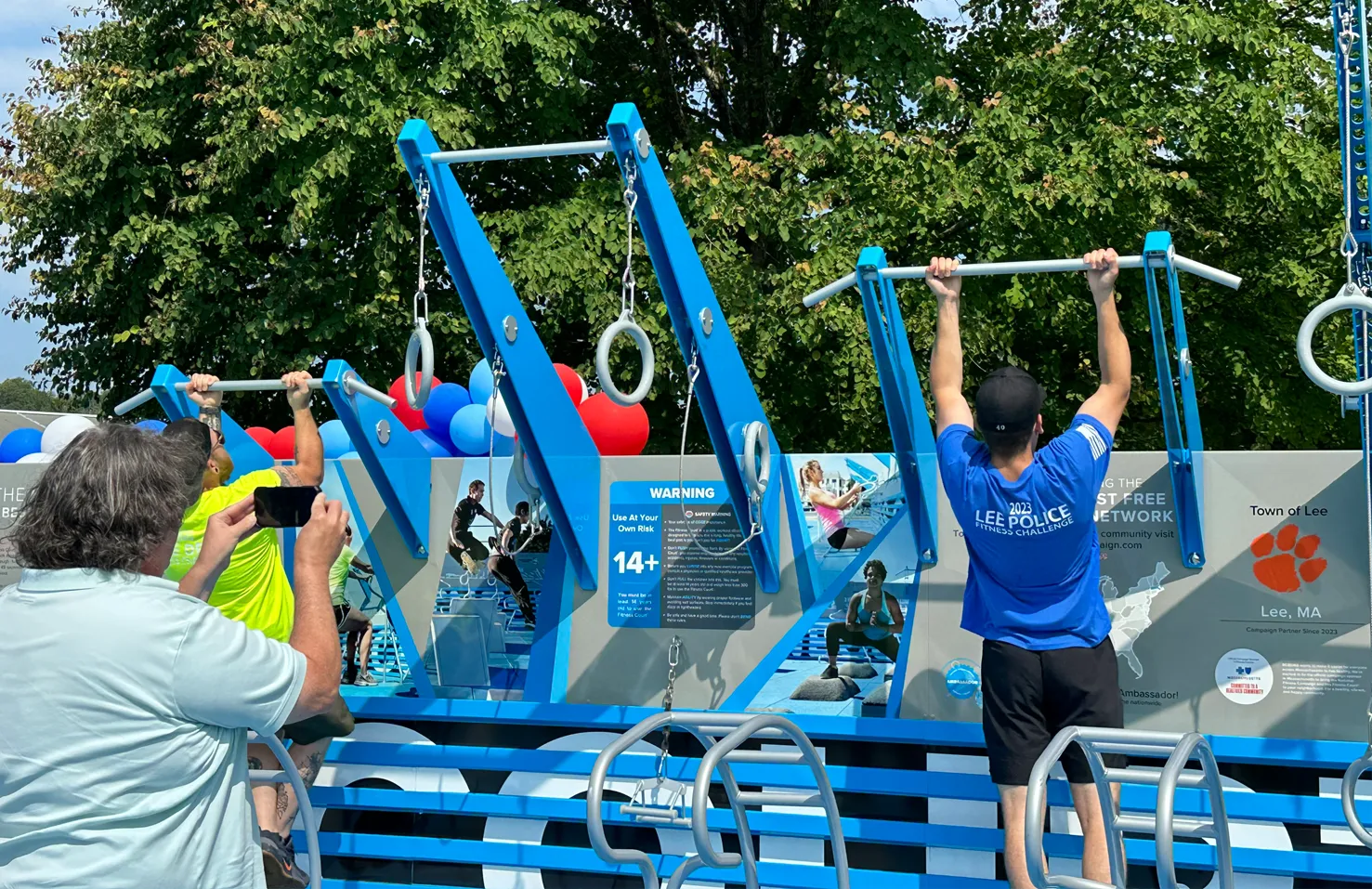 The Town of Lee Police Department and Department of Public Works (DPW) broke in the Fitness Court® with a fitness challenge emceed with special play-by-play from Live 95.9 local radio. After a friendly competition, the DPW came out on top and received a trophy – the Lee community was so inspired they have been asking for a rematch! In addition to radio interviews after the demonstrations of all seven stations on the Fitness Court®, the town’s local paper, The Berkshire Eagle, was on site to capture all the excitement from the day. Attendees were able to try out the Fitness Court® for themselves, grab healthy snacks that were donated by a local grocery store and learn more about active programming with Soules Fitness and Lee Middle and High School programming for students, staff and families.