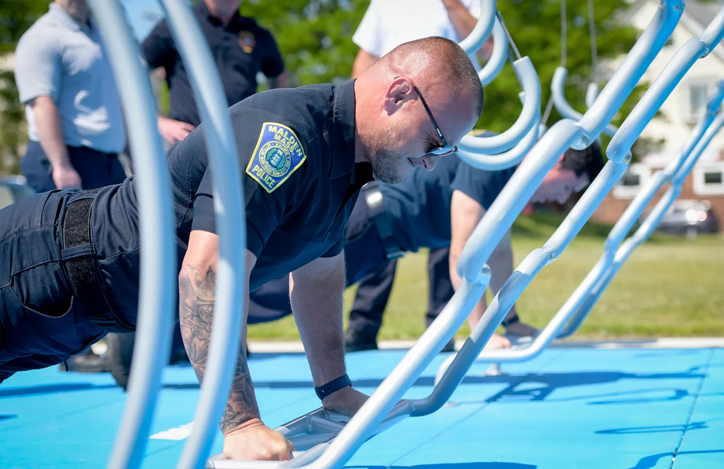 Once the ribbon was cut, it was time for the much-anticipated launch day challenge featuring first responders from the Malden Police Department and Malden Fire Department. Local fitness ambassadors Julio Salado and Evan Le then demonstrated all seven stations of the Fitness Court® for community members and students. Attendees were also able to get an exclusive sneak peek of the Pride themed BlueBikes sponsored by Blue Cross as the official Pride month BlueBikes debuted on June 1st throughout the greater Boston area.