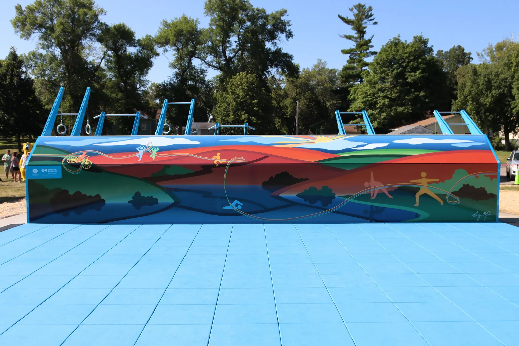 In addition to the ribbon cutting, Willmar-based sculpture artist Sonja Madsen was honored during the event for her artwork featuring graphics of outdoor activities like running, biking, and swimming through landscapes connected by a graphic trail on the Fitness Court® Studio.