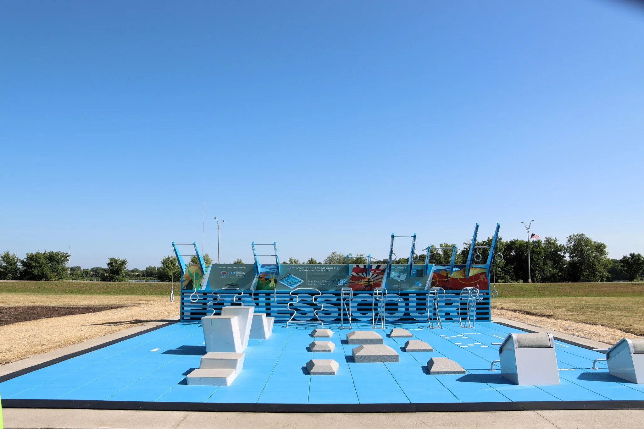 Madsen created "Out and About," a mural that is featured on the walls of the Fitness Court® Studio. Her mural design for the Sperry Park Fitness Court® Studio features graphic human images doing outdoor activities like running, biking and swimming through graphic landscapes and connected by a graphic trail.